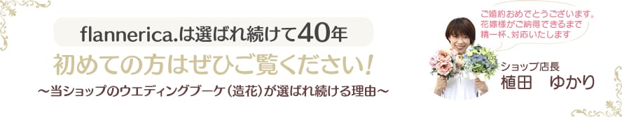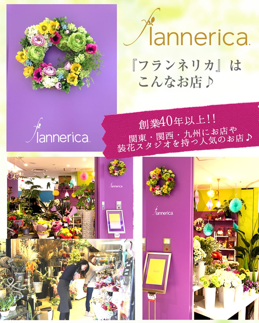flannerica.はウェディングフラワー専門店として関東・関西・九州にフラワーグッズのお店や、結婚式のブーケ・会場装花スタジオを持つ人気のお店です。